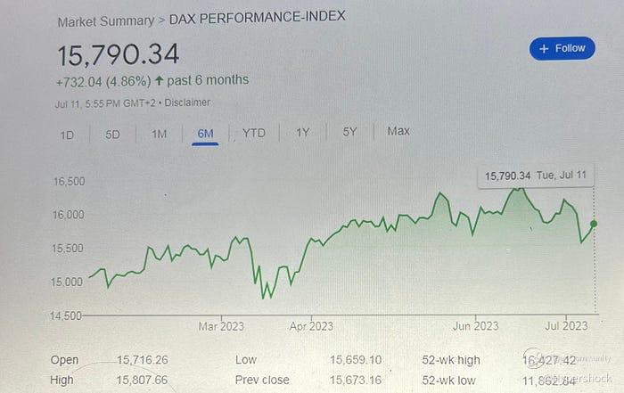 Germany’s largest stock exchange, the Frankfurt Stock Exchange (DAX), reached it’s high on June 16th, with 16,427.42 euros. It’s now at 15,790.34 euros. Germany recently entered a recession, with GDP growth at -0.3% in the first quarter of this year. But to make the most profit off of stocks, it’s best to buy when the market is low, and sell when the market is high.