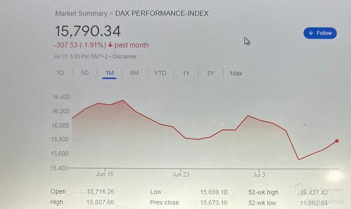 1 month view of DAX. Started of with a recession and ending lower than the first price