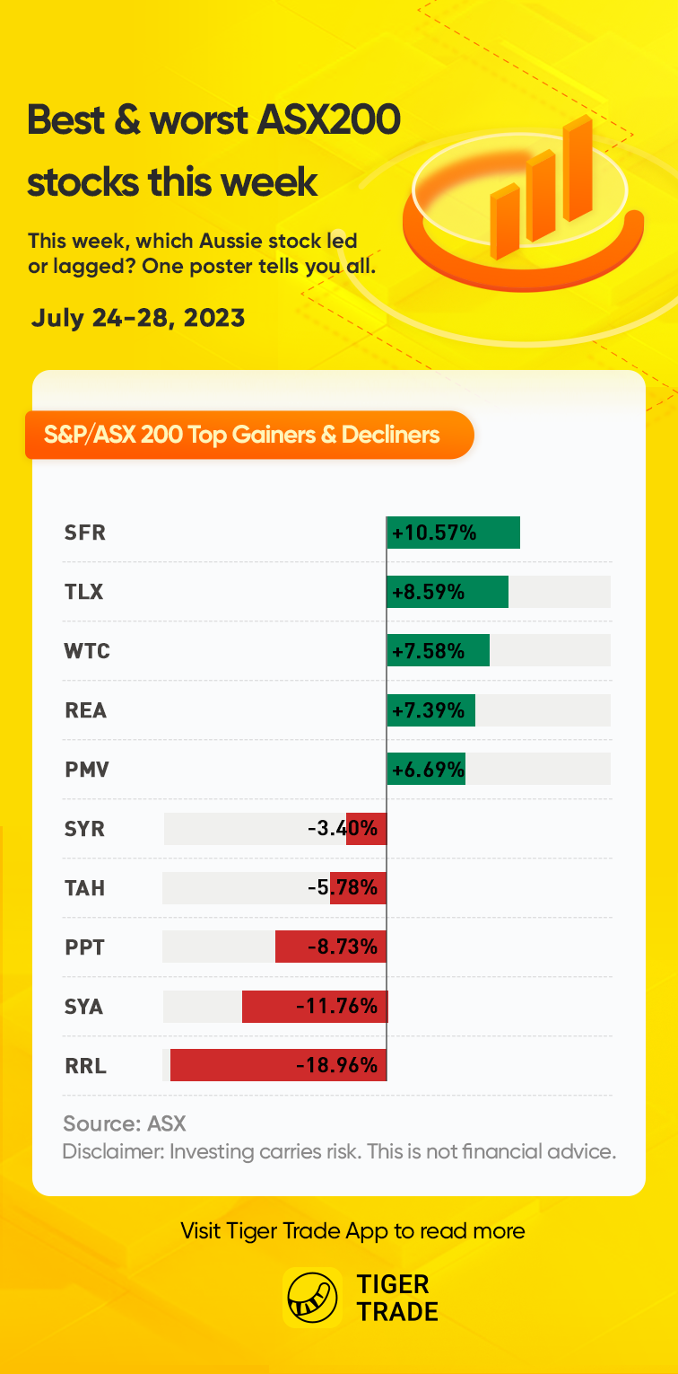 During the last 5 trading days, $Sandfire Resources NL(SFR.AU)$ was up 10.57%; $Telix Pharma(TLX.AU)$ added 8.59%; $Wisetech Global(WTC.AU)$ was up 7.58%; $Rea Group(REA.AU)$ rose 7.39%; and $Premier Investments Ltd(PMV.AU)$ increased 6.69%.