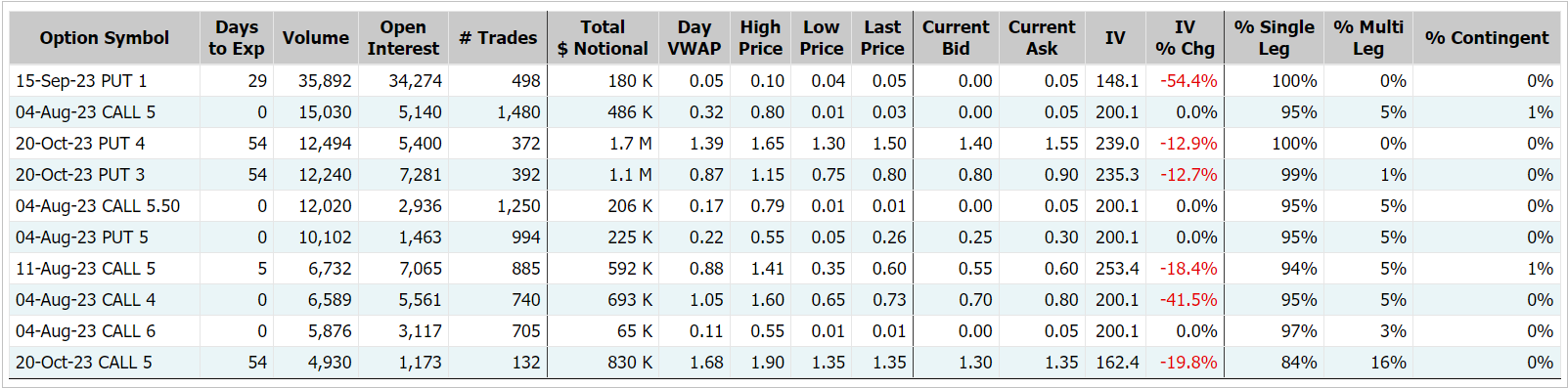 There are 748.6K Nikola option contracts traded on Friday, approximately 4.8 times the 90-day average trading volume. Call options account for 52% of overall option trades. Particularly high volume was seen for the $4.5 strike call option expiring August 11, with 74,829 contracts trading. NKLA 20230811 4.5 CALL