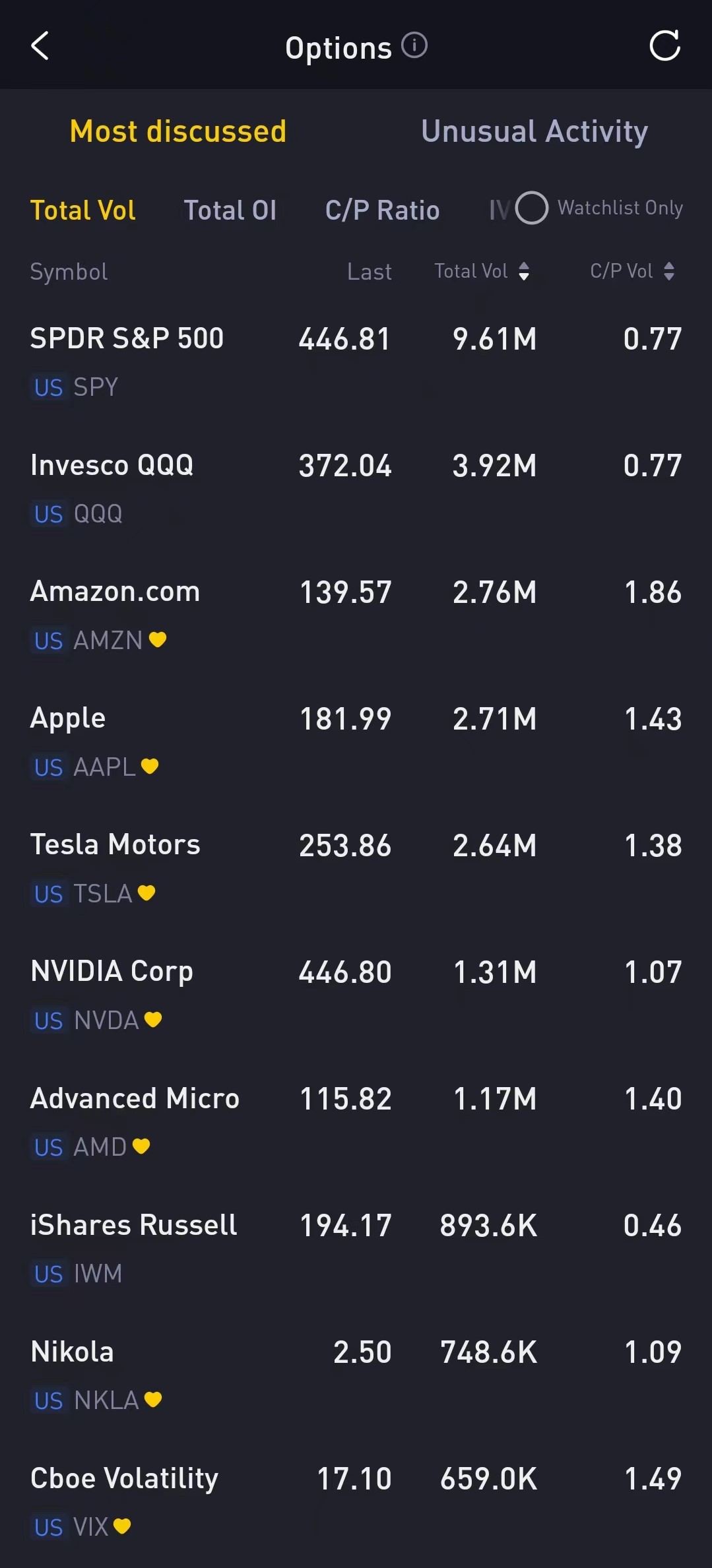 Top 10: $SPY(SPY)$; $QQQ(QQQ)$; $AMZN(AMZN)$; $AAPL(AAPL)$; $TSLA(TSLA)$; $NVDA(NVDA)$; $AMD(AMD)$; $IWM(IWM)$; $NKLA(NKLA)$; $VIX(VIX)$