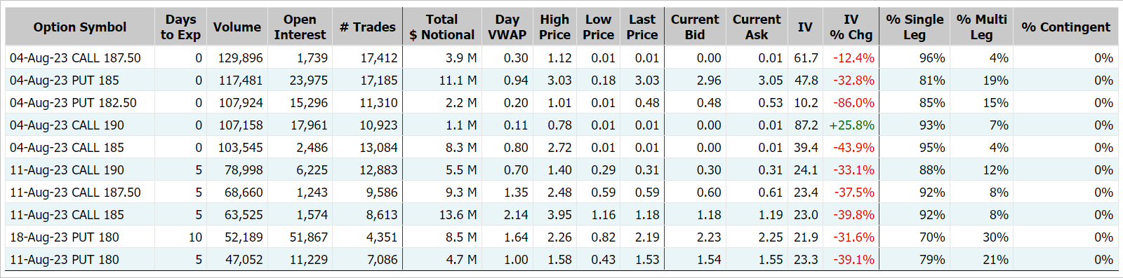There are 2.71 million Apple option contracts traded on Friday, up 99% from the previous trading day. Call options account for 59% of overall option trades. Particularly high volume was seen for the $187.5 strike call option expiring August 4, with 129,896 contracts trading. AAPL 20230804 187.5 CALL