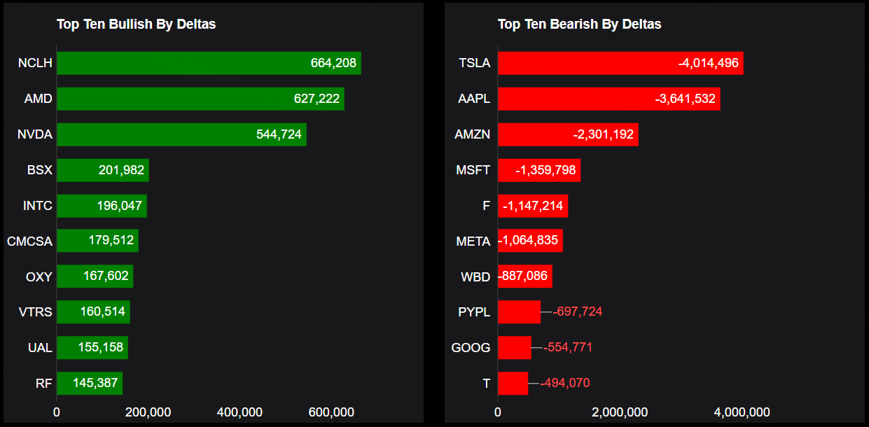 This report shows stocks with the highest volume of bullish and bearish activity by option delta volume, which converts option volume to an equivalent stock volume (bought or sold).
