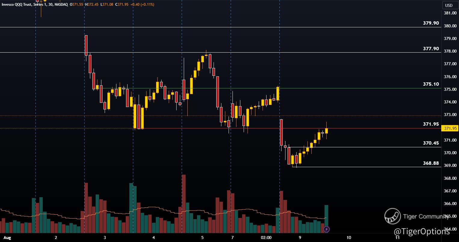 Buy Puts/Sell Calls when the price is below 371.95. Take profits when the price reaches 368.88-370.45 or anytime when you’re in profits. [Great]