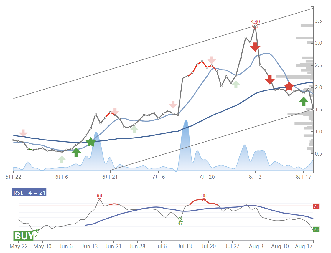 The Nikola stock price fell by -22.96% on Monday, 21st Aug 2023 from $1.96 to $1.51. During the last trading day the stock fluctuated 21.09% from a day low at $1.47 to a day high of $1.78. The price has fallen in 6 of the last 10 days and is down by -36.82% for this period. Volume has increased on the last day by 47 million shares but on falling prices. This may be an early warning and the risk will be increased slightly over the next couple of days. In total, 101 million shares were bought and sold for approximately $151.96 million.