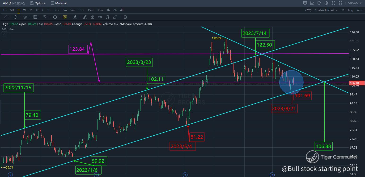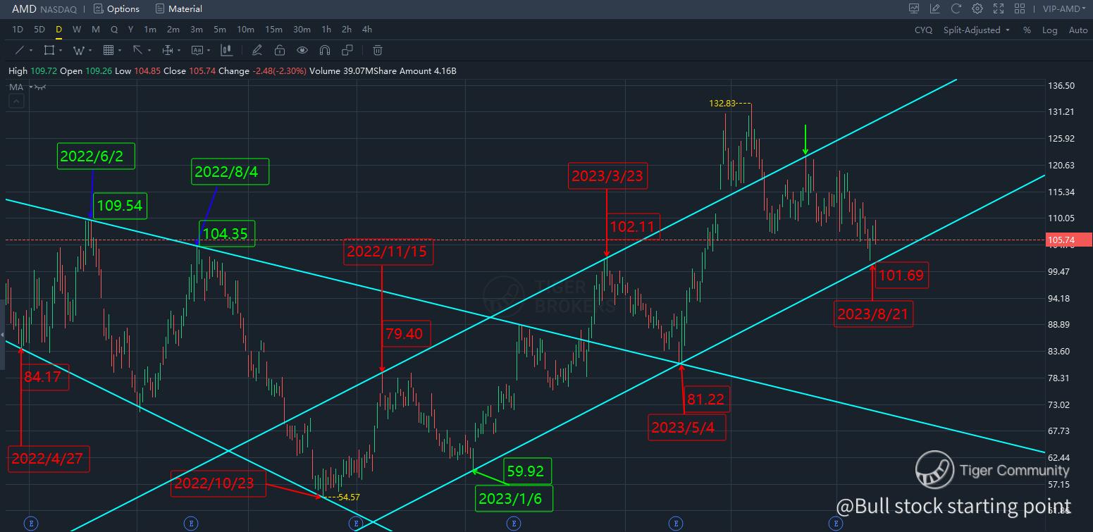 Now look at 2023/8/18, AMD once again retreated to the lower support line of the ascending channel, so 2023/8/18 is the best buying opportunity, from which we can judge that the new stage of AMD's rise has begun, and the effective support below bit at 101.69. When the 101.69 support level does not break through effectively, you can stick to long positions. This is the best opportunity to buy, but if it falls below the lower track effectively, you must avoid risks in time! Once you stand effectively, you can move on to see more.(as shown in Figure 5)