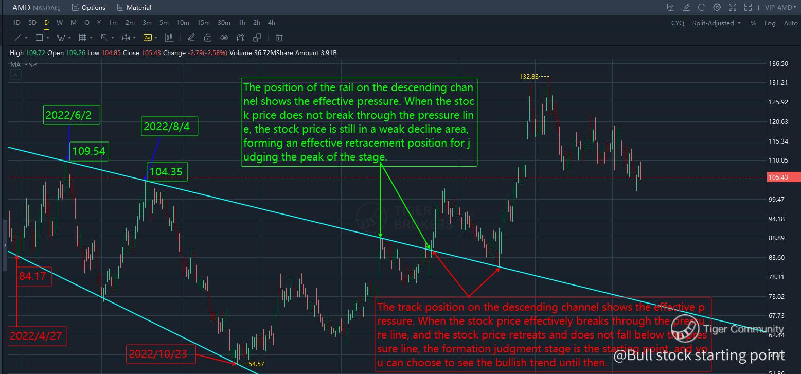 4.The position of the rail on the descending channel shows the effective pressure. When the stock price does not break through the pressure line, the stock price is still in a weak decline area, forming an effective retracement position for judging the peak of the stage.(as shown in Figure 3)