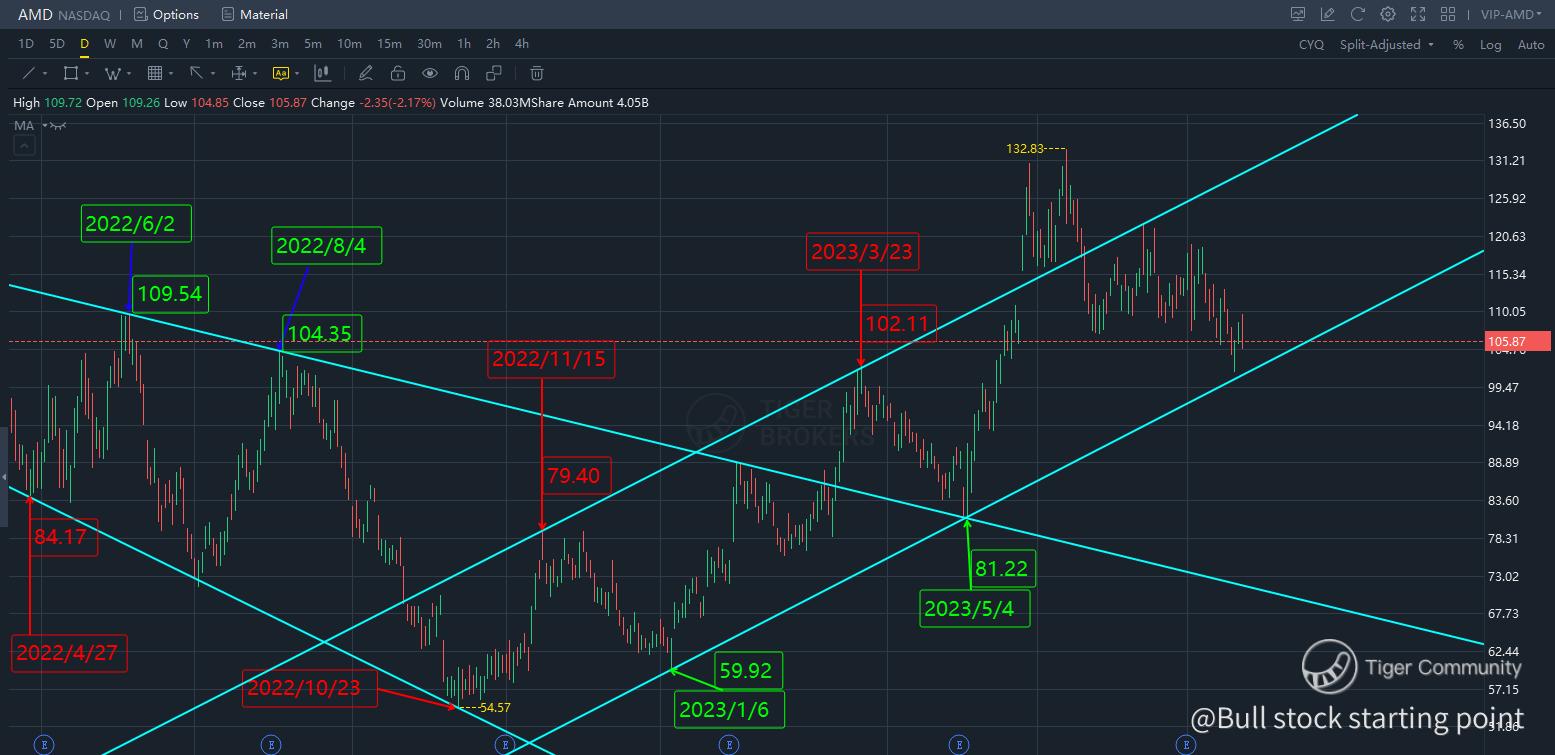 AMD formed an effective support at the lower track position on May 4, 2023, and at the same time formed an effective support at the rising track support level. The intersection of three points forms the trend that the stock starts to rise and starts to rise. The price was bought at 81.22, and the highest rose to 132.83, an increase of 63.5%. This shows the starting point for evaluating the value of this channel.(as shown in Figure 5)