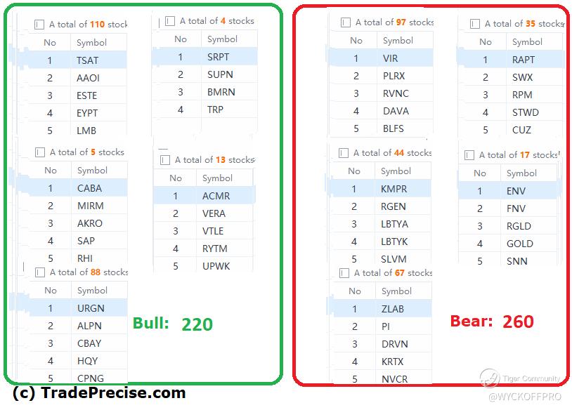 The bullish vs. bearish setup is 220 to 260 from the screenshot of my stock screener below pointing to a negative market environment. This is expected after the ongoing market correction started 3 weeks ago.