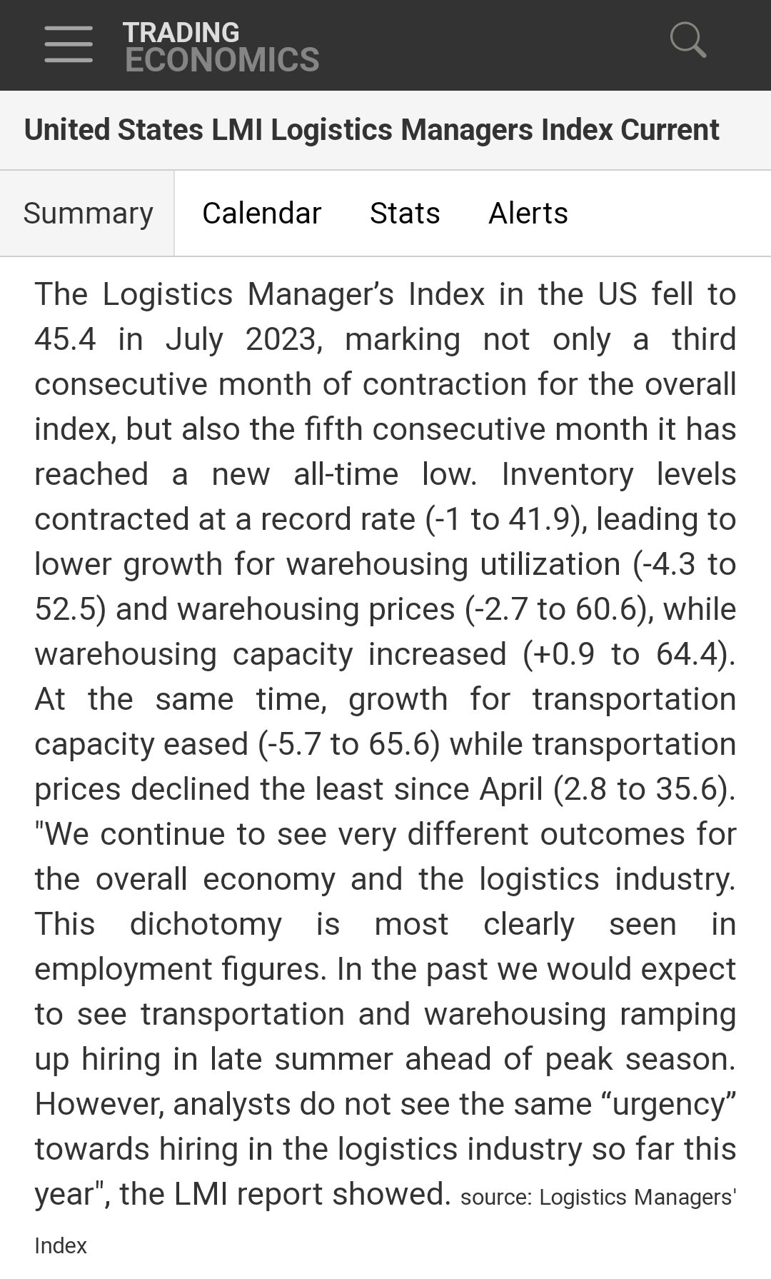 From the LMI index and its detailed explanation, there is no "urgency" to hire for the coming peak season. This could imply either there are sufficient resources, a lack of demand or both. The LMI has been falling since January 2023.