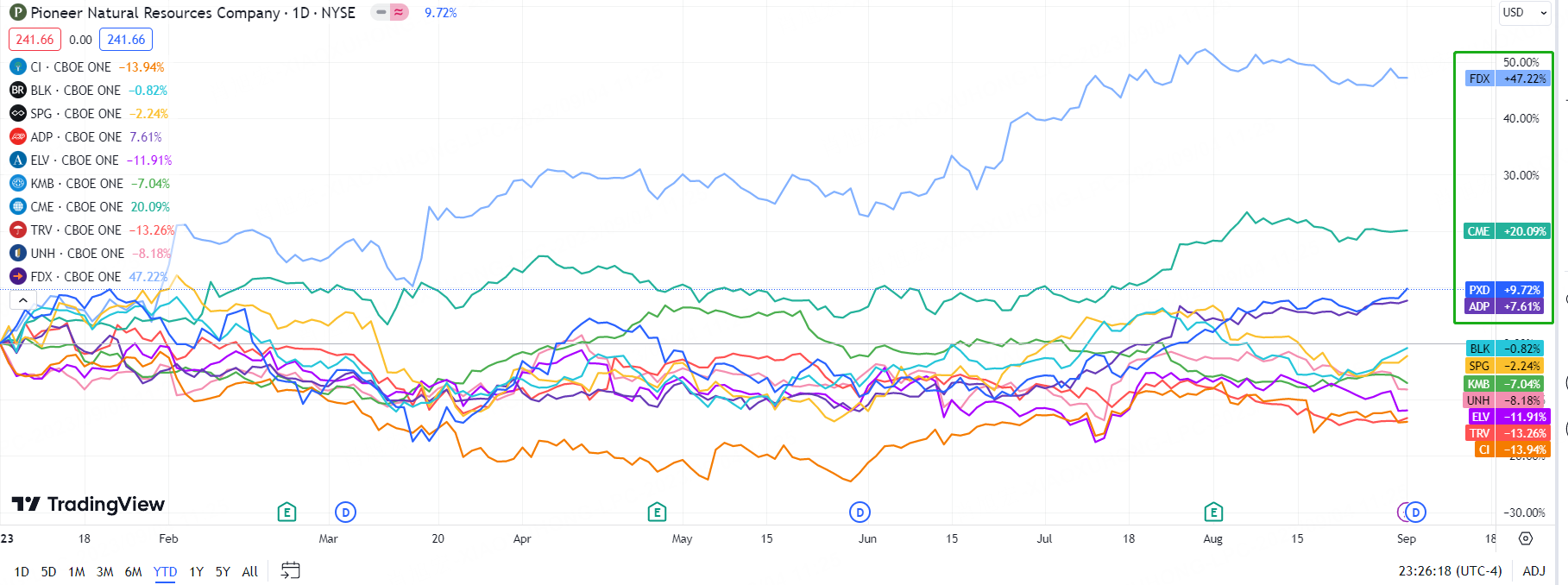 Below are the YTD 2023 of 11 stocks and 4 out of 11 stocks see a positive return in 2023: $FedEx(FDX)$ , $CME Group Inc(CME)$ , $Pioneer Natural Resources(PXD)$ , $Automatic Data Processing Inc(ADP)$