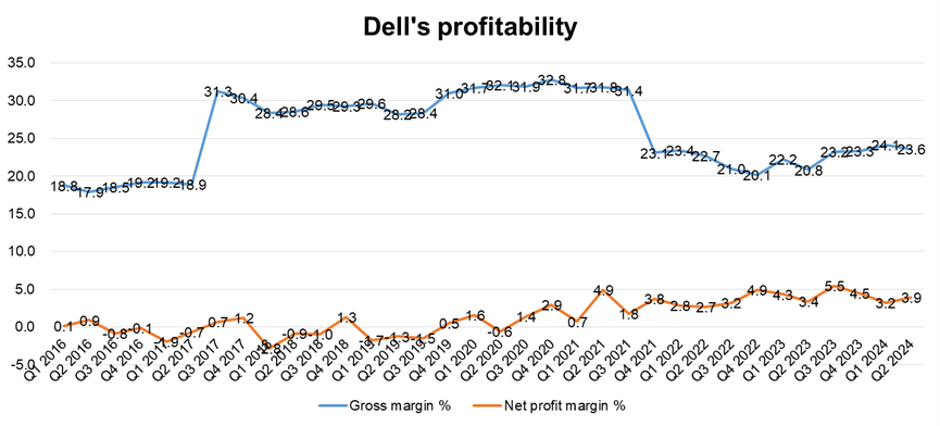 While AI can help Dell rejuvenate, the company's profitability is relatively low, with a gross margin of only 23.6% in the second quarter and an adjusted net margin of 3.9%: