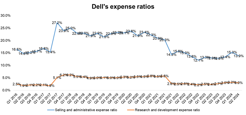 Before the outbreak of the pandemic, Dell's profitability was even more concerning. In terms of expense ratios, after the pandemic, Dell's sales and administrative expense ratio, as well as research and development expenses, both decreased significantly: