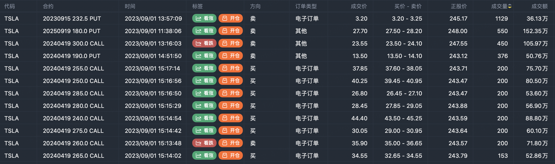 Last Friday, Tesla's forward call options were active, and according to the recent large order, institutions are optimistic that Tesla's stock price will not fall more than 232.5 in the nearly two weeks: