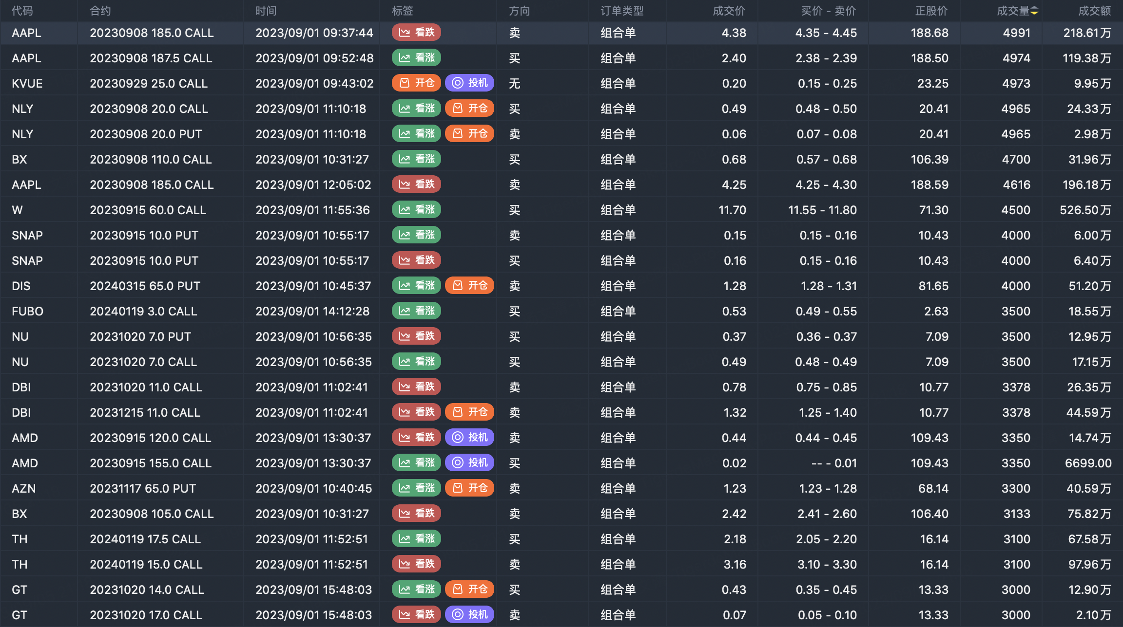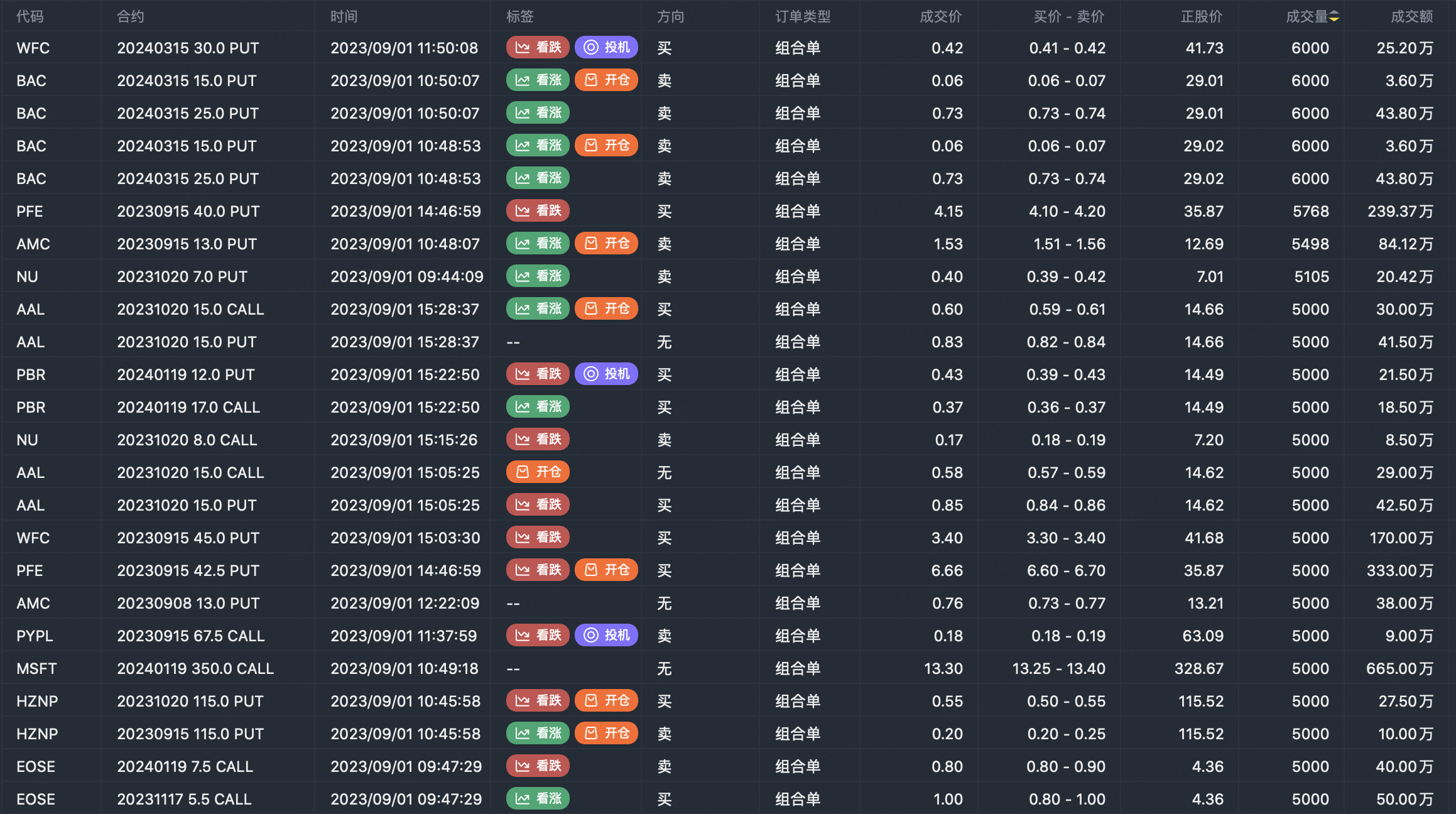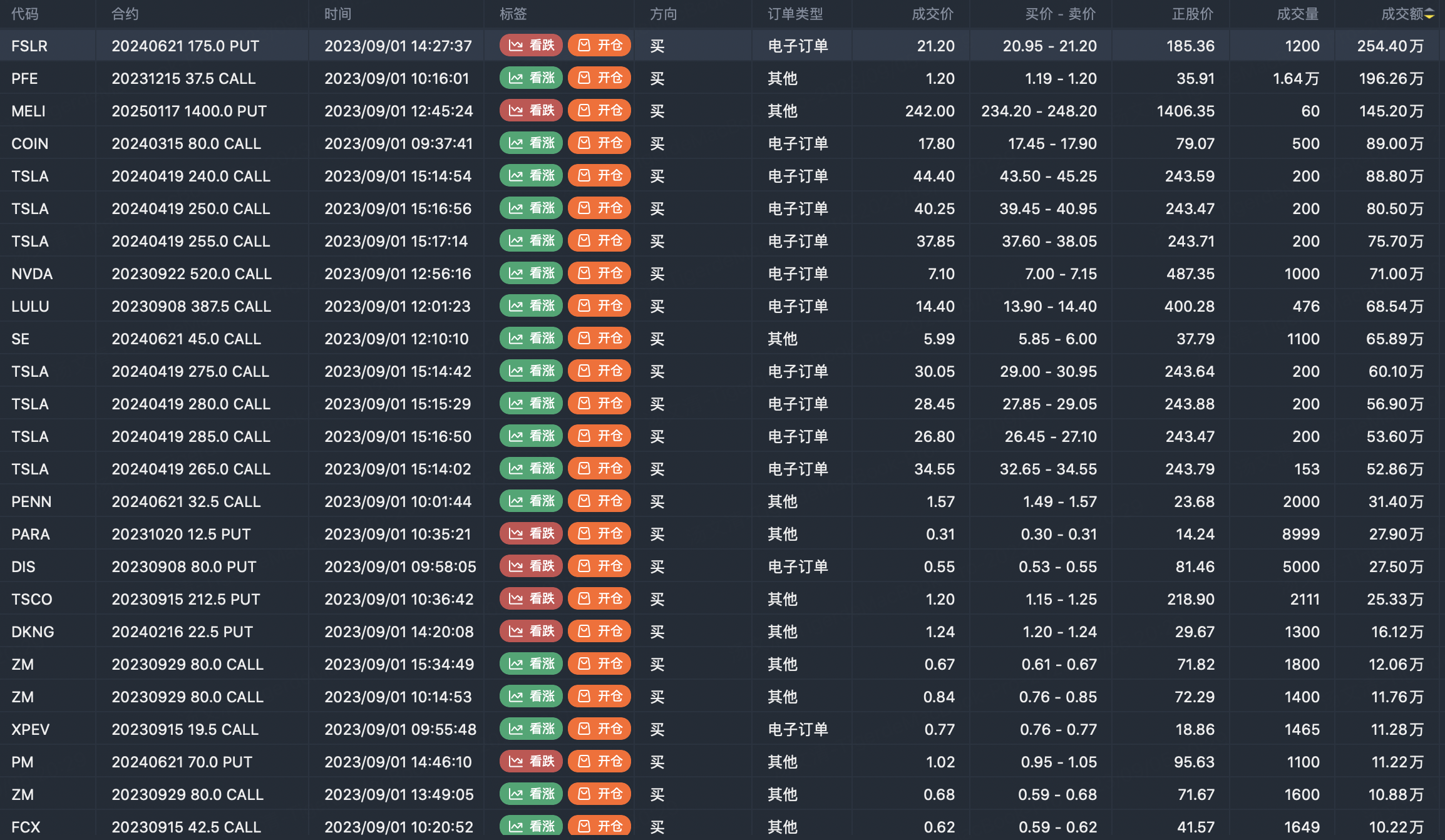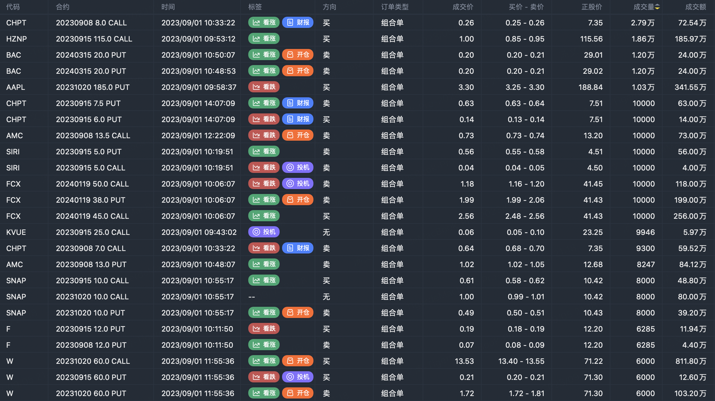 Note: This image data is from Tiger PC. This screen is a significant sell open position for an option contract in the market. A sell of a call option means that the trader believes that the underlying trend has peaked, and a sell of a put option means that the trader believes that the underlying trend has bottomed. These contract openings typically indicate significant activity in the underlying stock, including whether the trader is willing to accumulate a long or short option position.