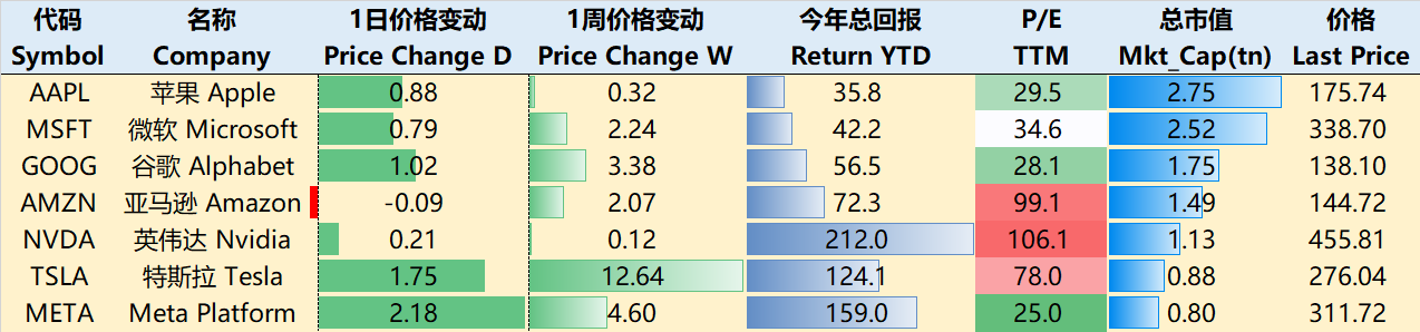 As of the closing on September 14th, all big techs record positive return over the past week. The strongest performers was $Tesla Motors(TSLA)$ with +12.64%, followed by $Meta Platforms, Inc.(META)$ with +4.6%, $Alphabet(GOOG)$ $Alphabet(GOOGL)$ with +3.38%, $Microsoft(MSFT)$ with +2.24%, $Amazon.com(AMZN)$ with +2.07%, $Apple(AAPL)$ with +0.32%, and $NVIDIA Corp(NVDA)$ with +0.12%.