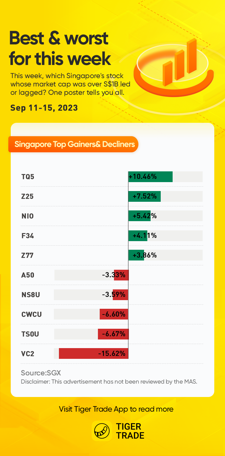 During the last 5 trading days, $FRASERS PROPERTY LIMITED(TQ5.SI)$, $YANLORD LAND GROUP LIMITED(Z25.SI)$, $NIO Inc.(NIO.SI)$, $WILMAR INTERNATIONAL LIMITED(F34.SI)$ and $SINGTEL 10(Z77.SI)$ are the top 5 weekly gainers, up 10.46%, 7.52%, 5.42%, 4.11% and 3.86% respectively.