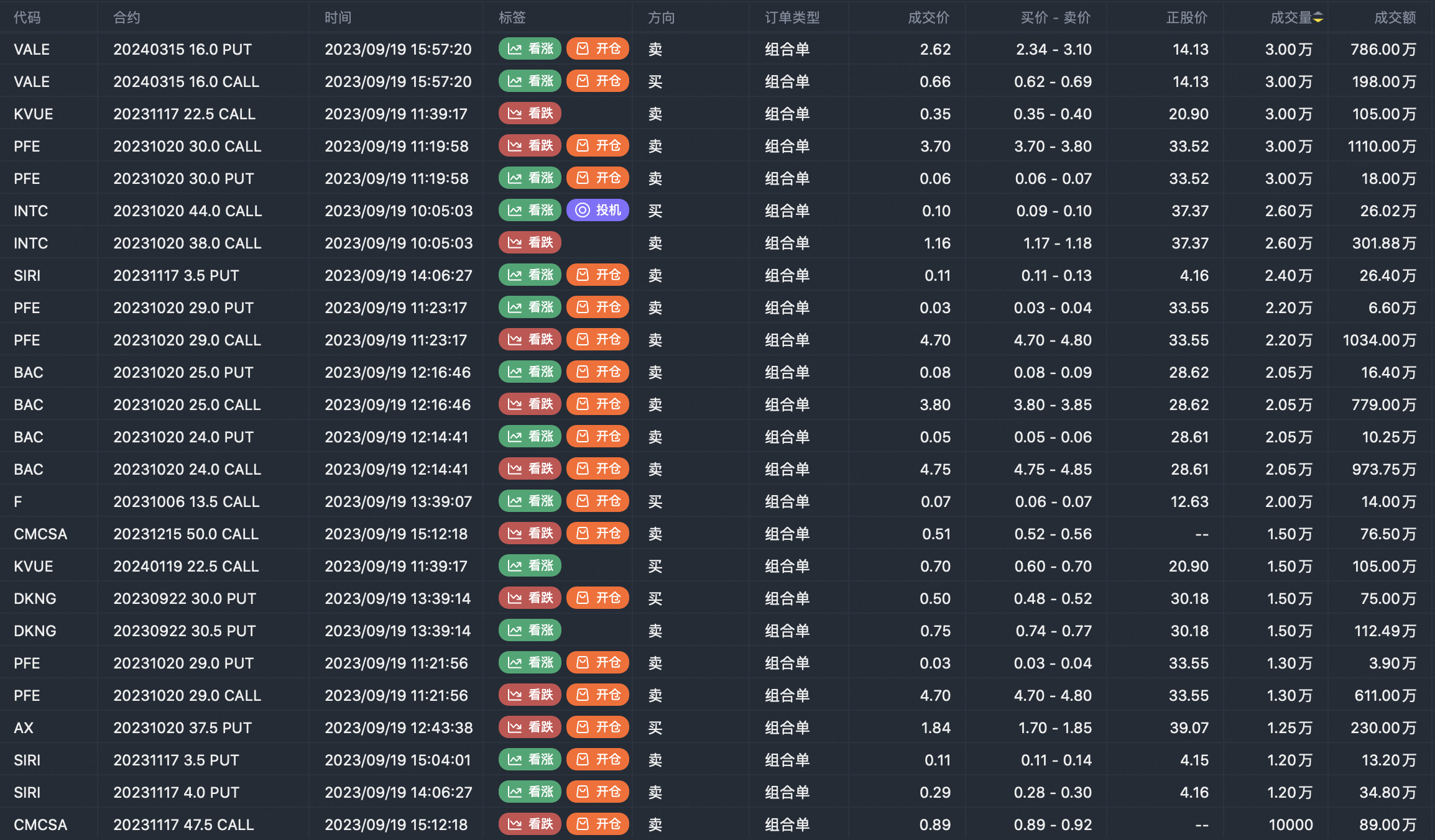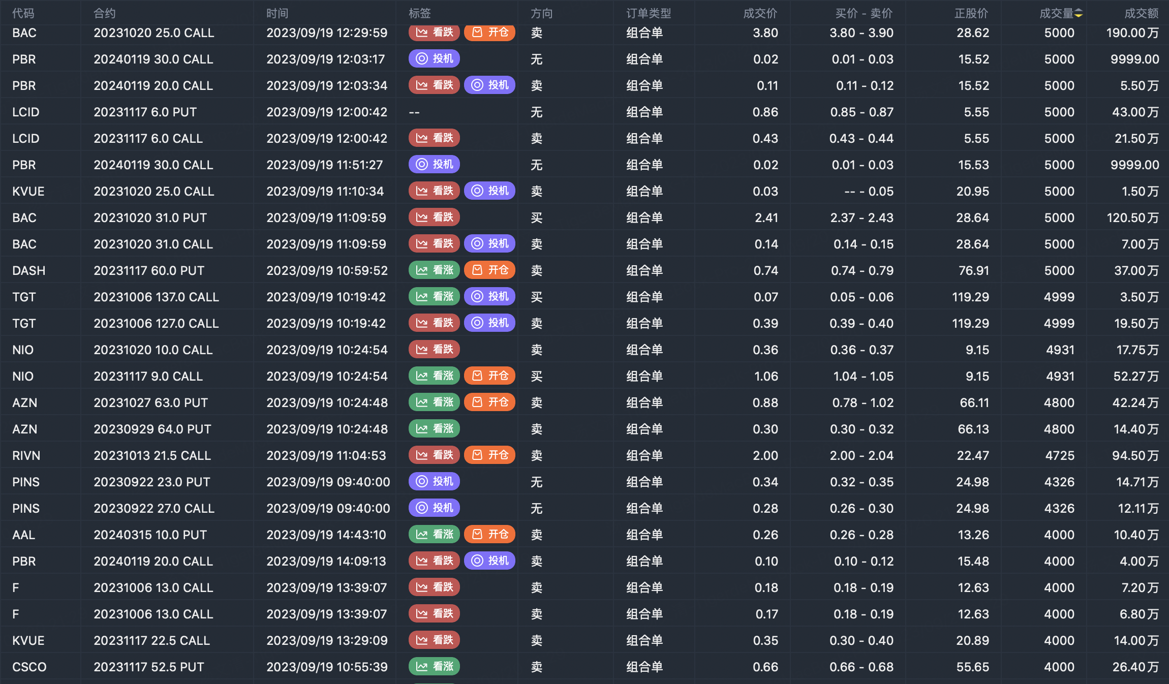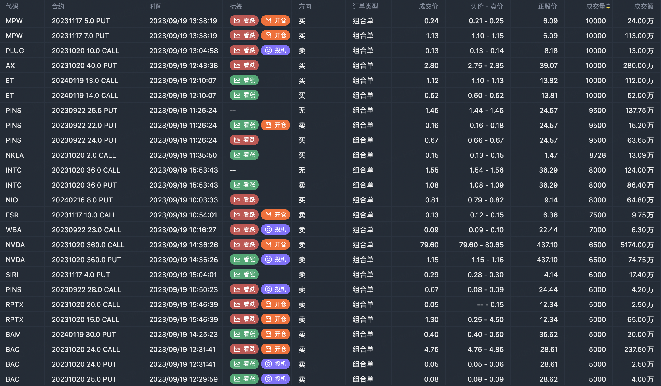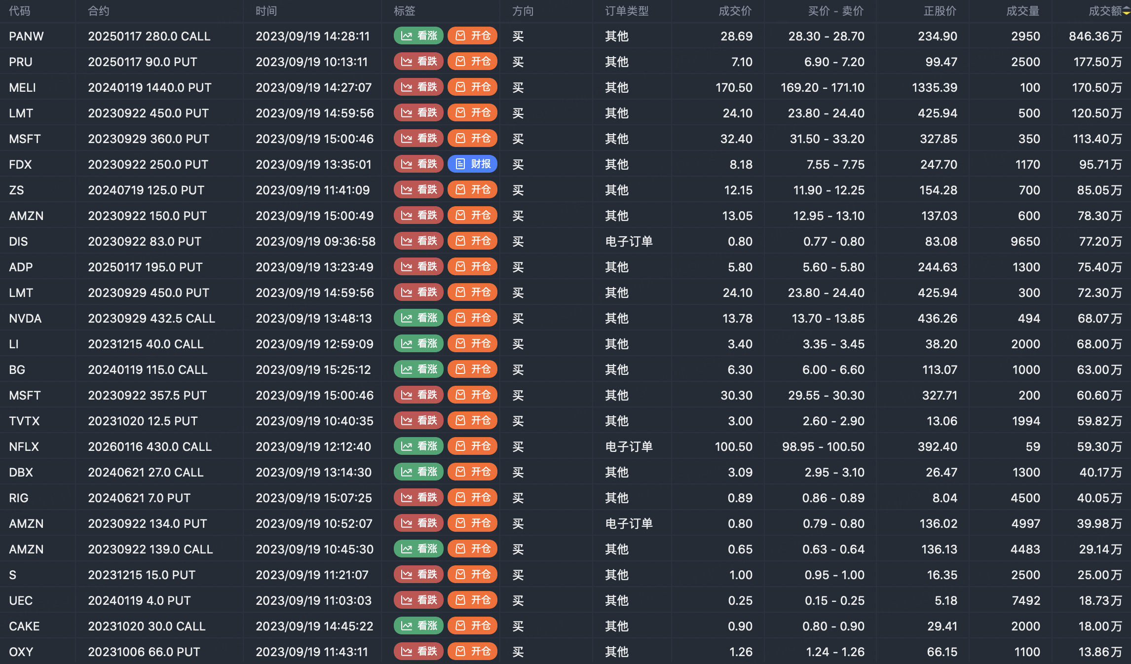 Note: This image data is from Tiger PC. This screen is a significant sell open position for an option contract in the market. A sell of a call option means that the trader believes that the underlying trend has peaked, and a sell of a put option means that the trader believes that the underlying trend has bottomed. These contract openings typically indicate significant activity in the underlying stock, including whether the trader is willing to accumulate a long or short option position.