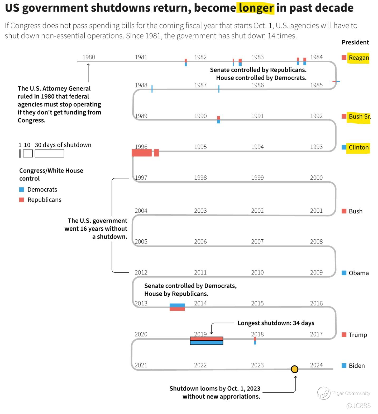 Chart shows the timeline of the 14 US government shutdowns from 1981 to 2020, and the current potential shutdown looming by Oct. 2023 if Congress fails to enact spending measure.