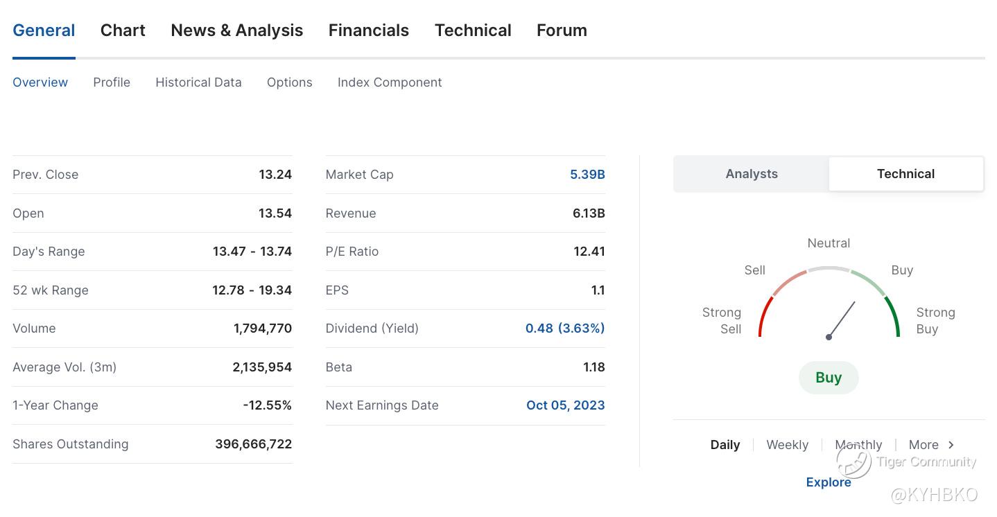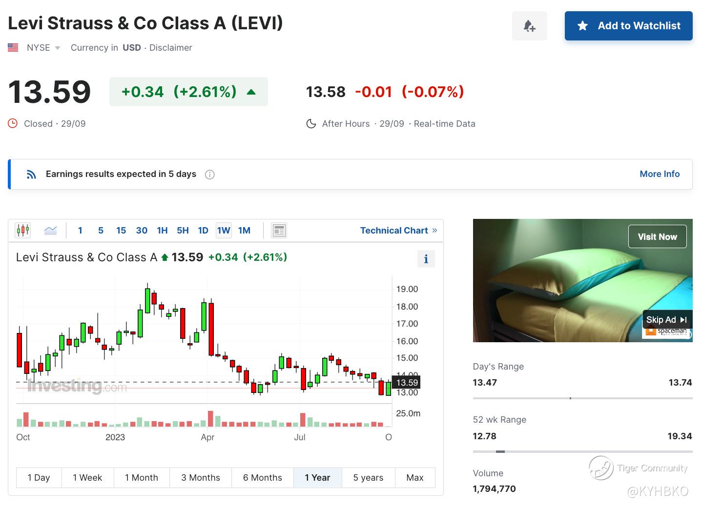 Levi is ranging along the bottom. The current price of 13.59 is near the 52-week low of 12.78.