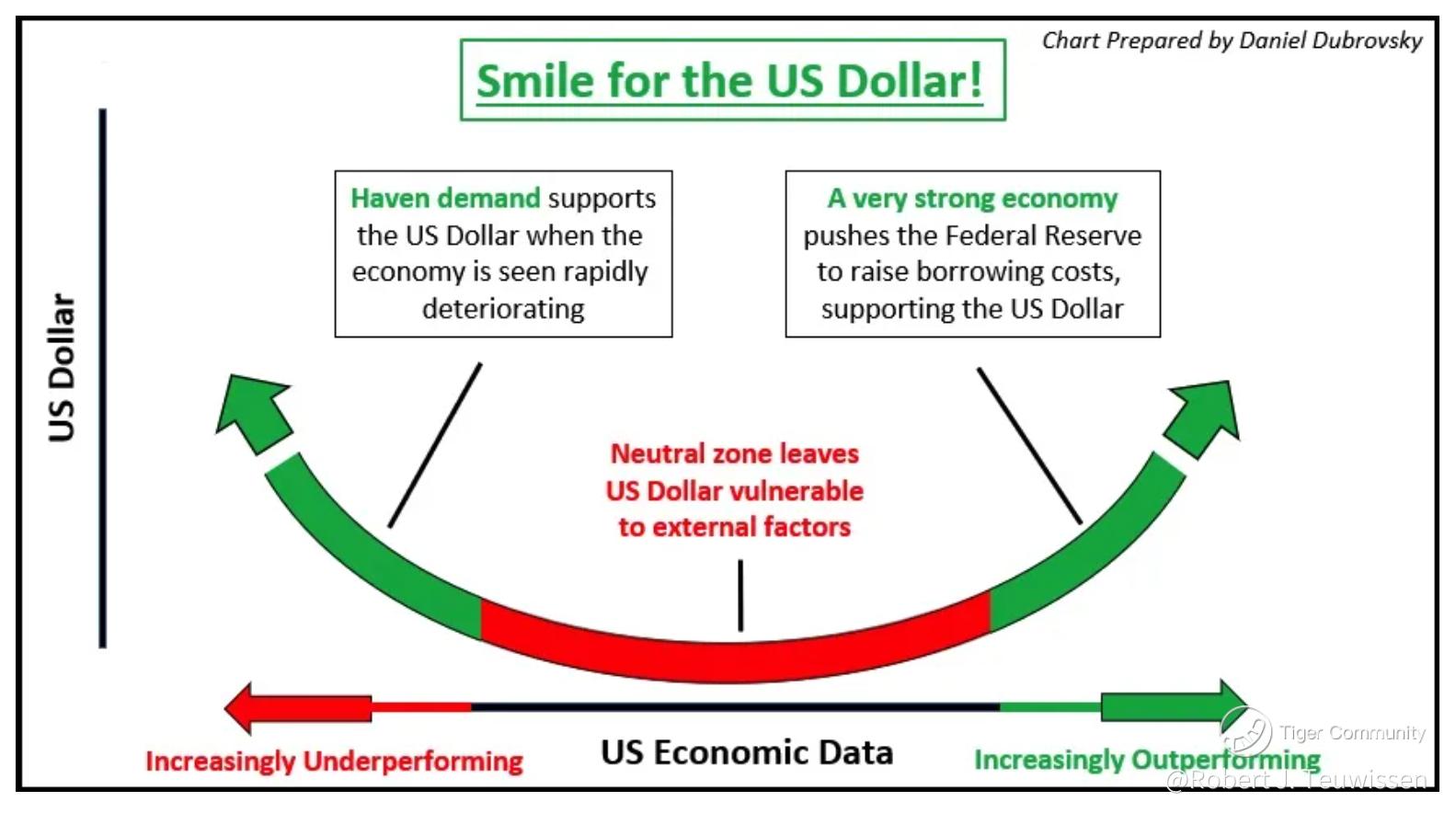 2. The dollar is a special currency. It is still the world’s reserve currency. As a reserve currency, the United States is effectively a banker to the rest of the world. This makes it possible and even desirable to constantly run a current account deficit. Because of that deficit, the reserve currency looks fundamentally weak but is actually relatively strong. A well-known example in this context is the chart of the dollar smile, a chart where the dollar is strong precisely when there is a crisis (everyone flees the dollar) or at the other extreme when the US economy is doing very well. In both cases, the dollar is rising. Only in between, does the dollar tend to fall because that is when fundamentals come to the surface.