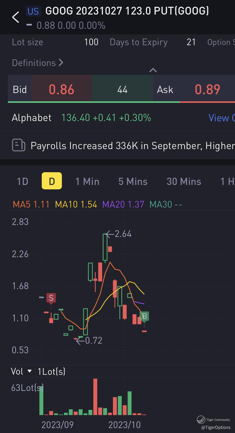By September 26, the GOOG stock price continued to decline, and my put option's value skyrocketed to $2.64. My unrealized loss had reached -123.7%. The situation wasn't looking favorable. [Spurting]
