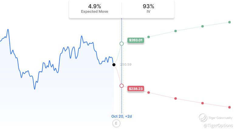 According to options pricing, the market is anticipating an expected move of approximately 4.9% for Tesla following its earnings report. This implies a price range between $238.23 (4.9% down) and $263.01 (4.9% up) from the stock's current price. Earnings can be a major catalyst for stock price movement, and the expected move accounts for this anticipated volatility.