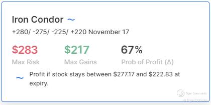 Probability and Risk/Reward: The probability of profit for this Iron Condor trade idea is estimated at 67%, suggesting a decent chance of success. It's important to note that the max risk and max gains are defined and limited: