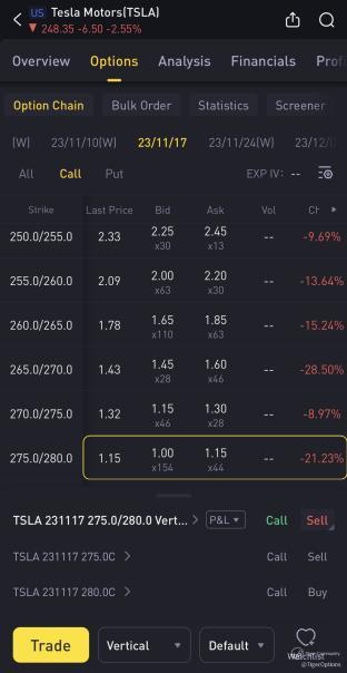 Sell the 275 Call and buy the 280 Call with the same expiration date (November 17). This creates a bearish call spread, as we believe Tesla won't exceed $275.