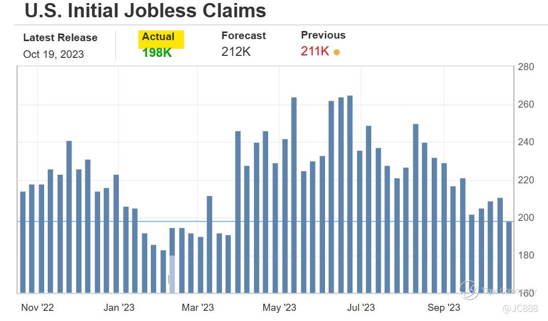 US weekly jobless claims for week ending 14 Oct 2023 came in at 198,000.