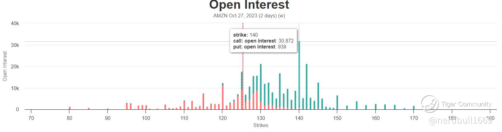 AMZN has a total open interest of 373,186 contracts and a put-call ratio of 0.53 for options expiring Oct 27, 2023 (2 days).
