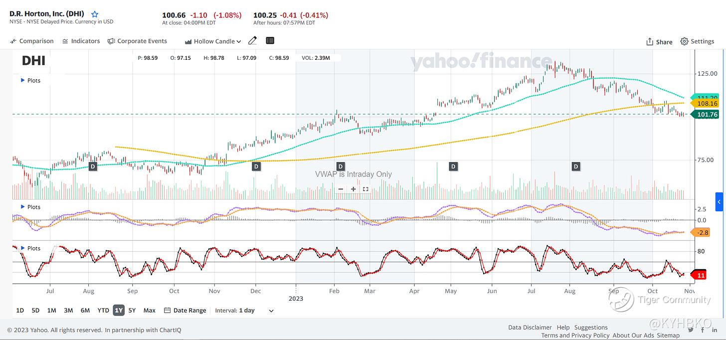 DHI closed the day (4pm EDT, 25 Oct 2023) at 100.66. This is not far from the Quarterly low of 94.22. While this can be a good price to enter with a good margin of safety (based on Berkshire’s entry),