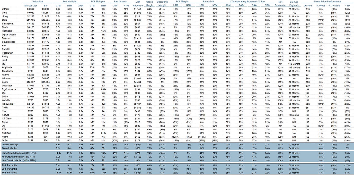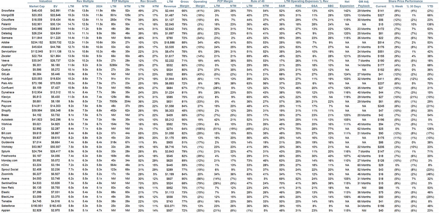 Rule of 40 shows rev growth + FCF margin (both LTM and NTM for growth + margins). FCF calculated as Cash Flow from Operations - Capital Expenditures
