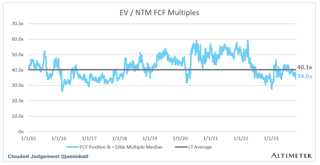 The line chart shows the median of all companies with a FCF multiple >0x and <100x. I created this subset to show companies where FCF is a relevant valuation metric.