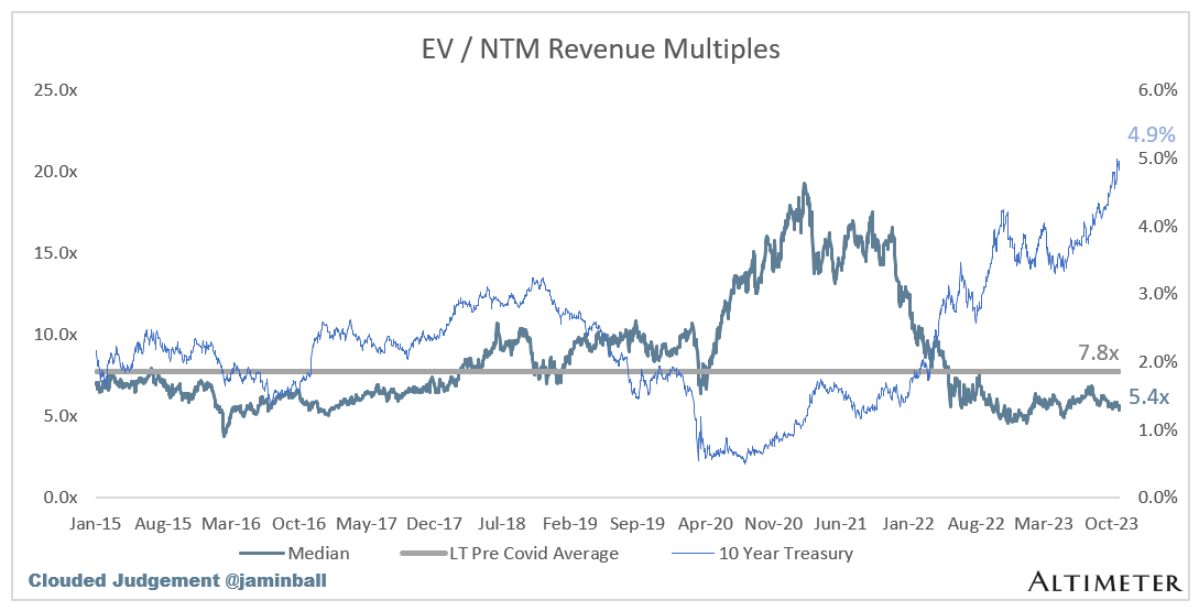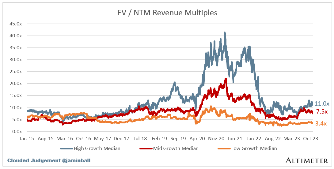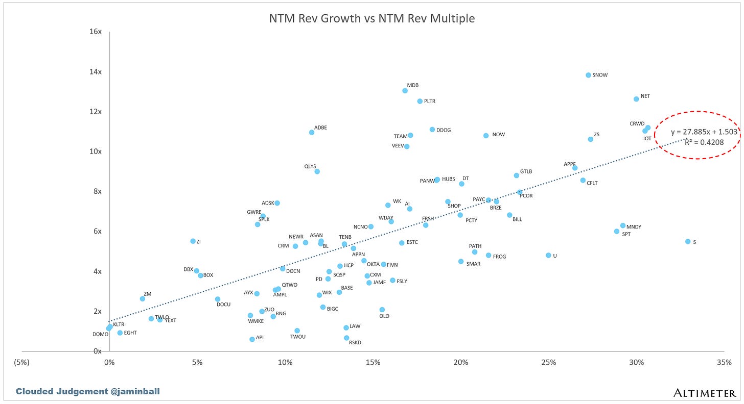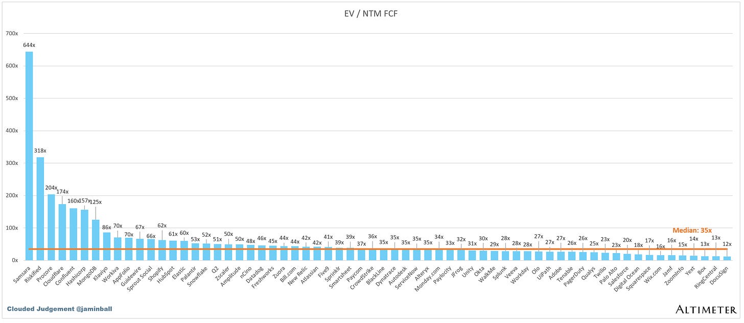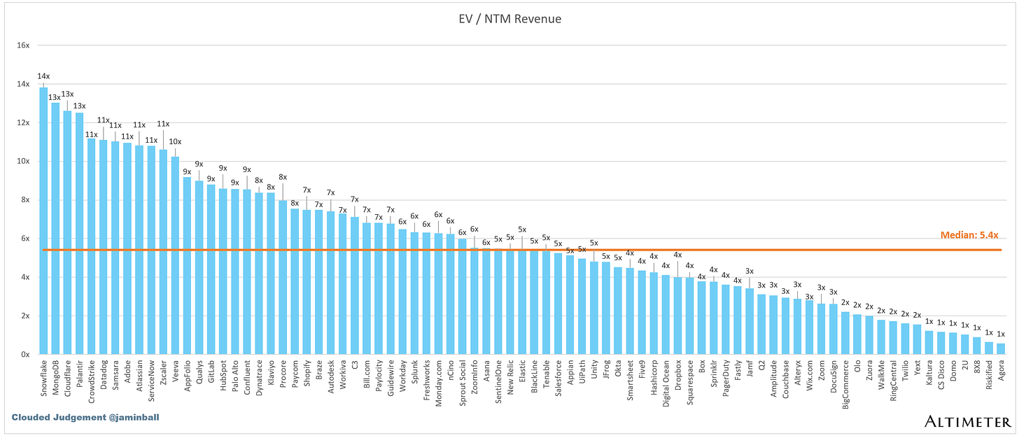 SaaS businesses are generally valued on a multiple of their revenue - in most cases the projected revenue for the next 12 months. Revenue multiples are a shorthand valuation framework. Given most software companies are not profitable, or not generating meaningful FCF, it’s the only metric to compare the entire industry against. Even a DCF is riddled with long term assumptions. The promise of SaaS is that growth in the early years leads to profits in the mature years. Multiples shown below are calculated by taking the Enterprise Value (market cap + debt - cash) / NTM revenue.