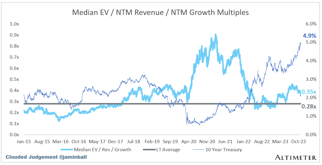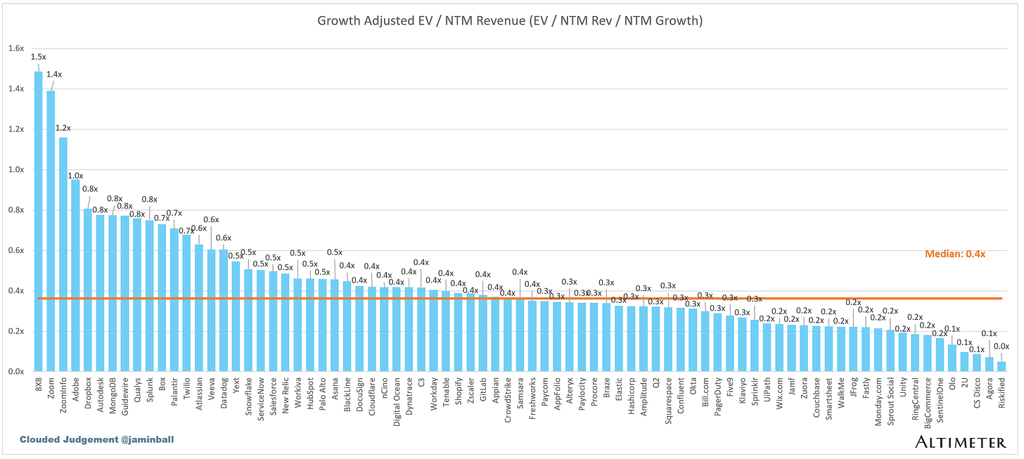 The below chart shows the EV / NTM revenue multiple divided by NTM consensus growth expectations. So a company trading at 20x NTM revenue that is projected to grow 100% would be trading at 0.2x. The goal of this graph is to show how relatively cheap / expensive each stock is relative to their growth expectations