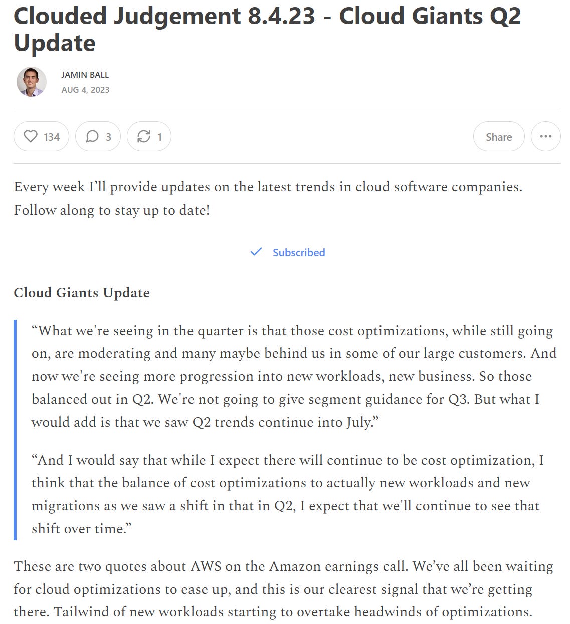AWS was the most positive sounding when it came to trends around optimizations. They had a similar message to last quarter of optimizations starting to slow down, and new workload strength continuing. You can read some quotes from their earnings call below.