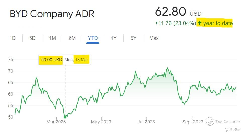In contrast, BYD’s YTD performance is a respectable +23.04% gain, with a bottom price of $50 per share on 13 Mar 2023. It has since been on an upwards trajectory.