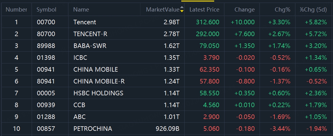 Top 10 Stocks by market cap of HK Market, data as of 11/6/2023