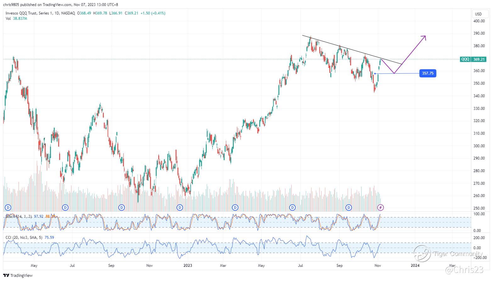 Stocks have demonstrated remarkable resilience, particularly as the United States ushers in a seasonally robust phase of the year. The $S&P 500(.SPX)$, has rebounded by more than 6% since late October, primarily propelled by the prevailing conjecture that the Federal Reserve has concluded its course of interest rate hikes. Simultaneously, the yields on 10-year US Treasury bonds have retreated from their zenith of 5%, as discerning investors endeavour to secure favourable yields while contemplating the possibility of a termination of rate increases on the horizon. These dynamics have set the stage for the $Invesco QQQ Trust-ETF(QQQ)$, a representation of the Nasdaq-100, to undergo a brief retracement prior to embarking on a substantial upturn as the year concludes.