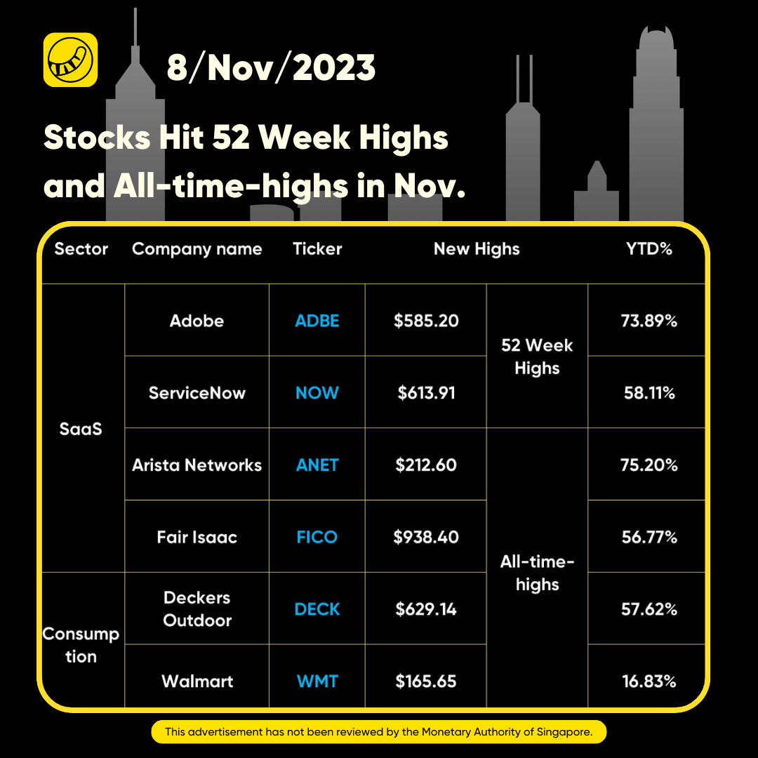 Many stocks have hit 52-week highs or all-time highs, including some notable companies such as Adobe (ADBE), ServiceNow (NOW), Arista Networks (ANET), Fair Isaac (FICO), Deckers Outdoor (DECK), and Walmart (WMT). These companies have shown significant year-to-date gains and positive performance indicators.