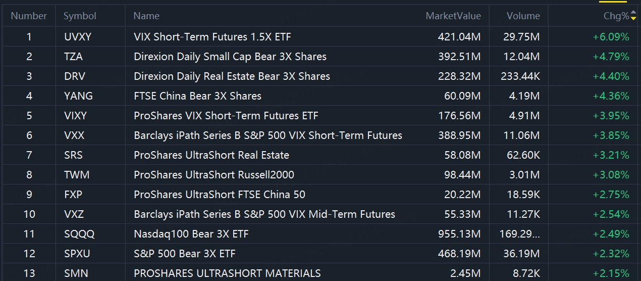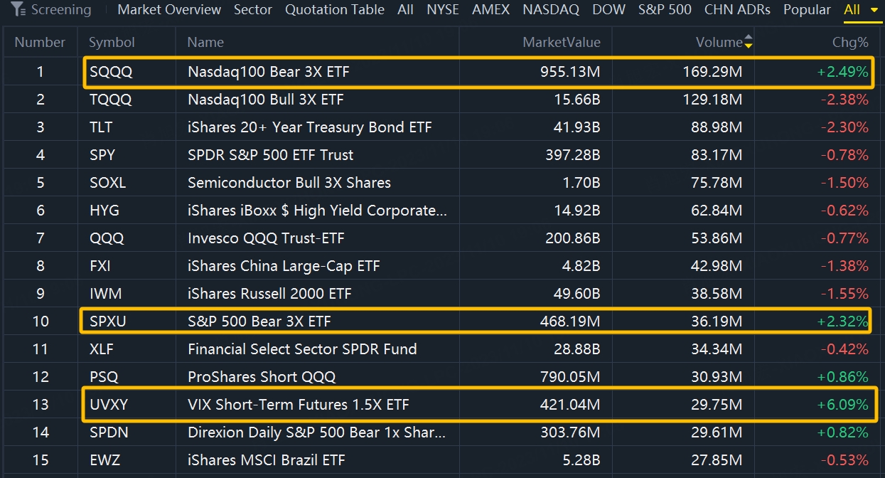 According to trading volume as of Thursday's close, only 3 ETFs $Nasdaq100 Bear 3X ETF(SQQQ)$ , $S&P 500 Bear 3X ETF(SPXU)$ , $VIX Short-Term Futures 1.5X ETF(UVXY)$ gained more than 2% in the ETFs list.