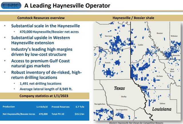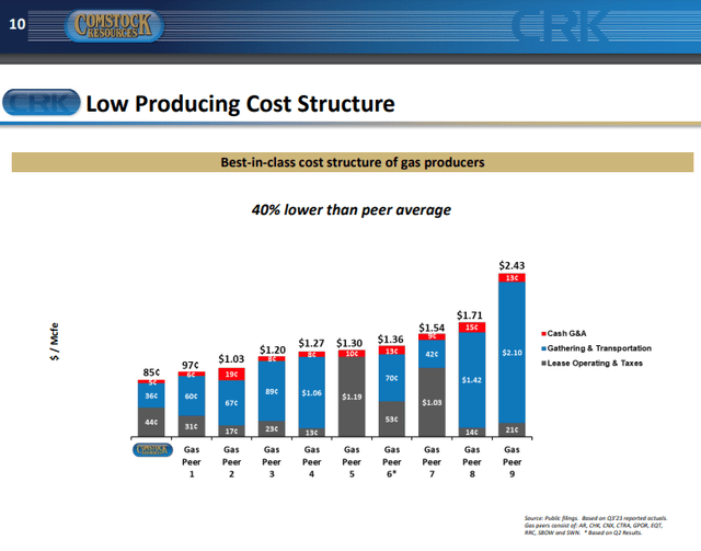 CRK was strategic in its 2019 expansion into the Haynesville with the $2.2 bn acquisition of Covey Park Energy. The Covey Park deal picked up 293,000 acres at $7,500 per acre. This helps give CRK a best-in-class cost structure as the slide below notes.
