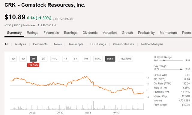- Comstock Resources stock is down 20% due to warmer weather and high gas storage levels.