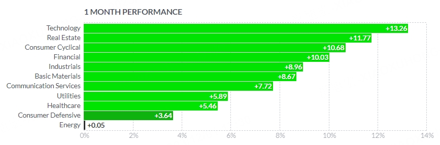 All sectors rose across the board, with the top three gainers being the technology, real estate and consumer cyclical industries. The healthcare, consumer defensive and energy sectors were the lowest gainers.