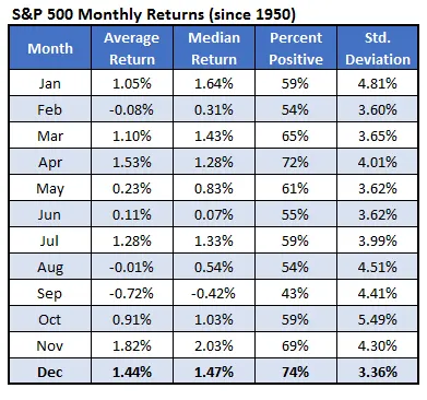 Looking at the historical data: December is one of the most interesting months in terms of stock market seasonality. The chart below summarizes the monthly returns of the $S&P 500(.SPX)$ since 1950. December is a historically strong month for stocks, ranking second behind April for average returns and first for positive returns.