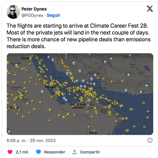 The image above taken from a tweet explains it all to us. A horde of jets descends on Dubai. The majority are private jets, which according to the organization Carbon Brief, it is estimated that there will be around 800 private planes that land in Dubai, emitting between them around 100,000 tons of carbon dioxide. The Telegraph states that with this figure the record can be reached for being the Summit that exceeds the carbon emissions of all of them. Doubling the figures from the Glasgow Summit.