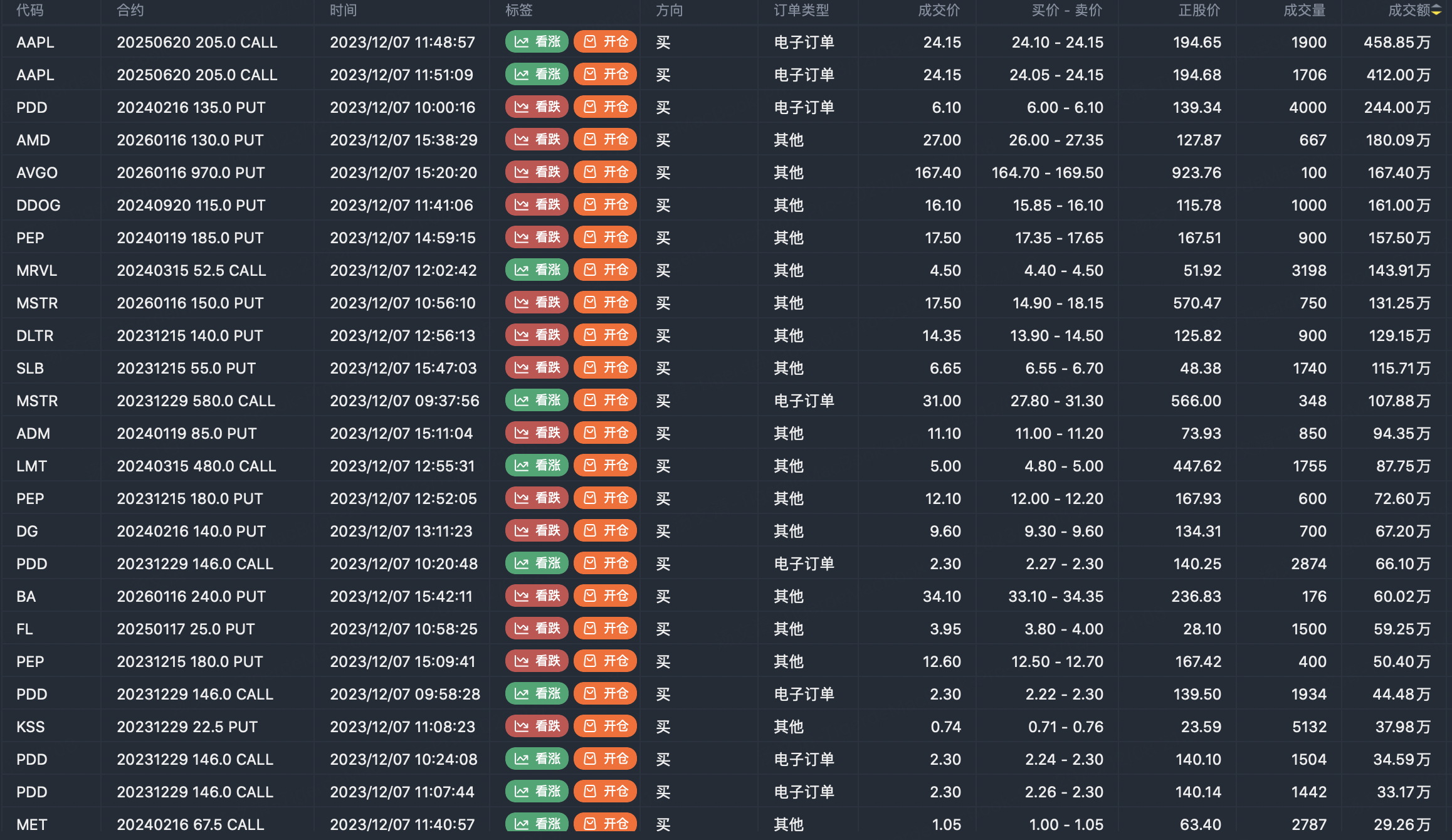 Note: This image data is from Tiger PC. This screening is a significant buy open position for options contracts in the market. The purchase of a call option means that the trader believes that the underlying has upward momentum, and the purchase of a put option means that the trader believes that the underlying has downward momentum. These contract openings typically indicate significant activity in the underlying stock, including whether the trader is willing to accumulate a long or short option position.