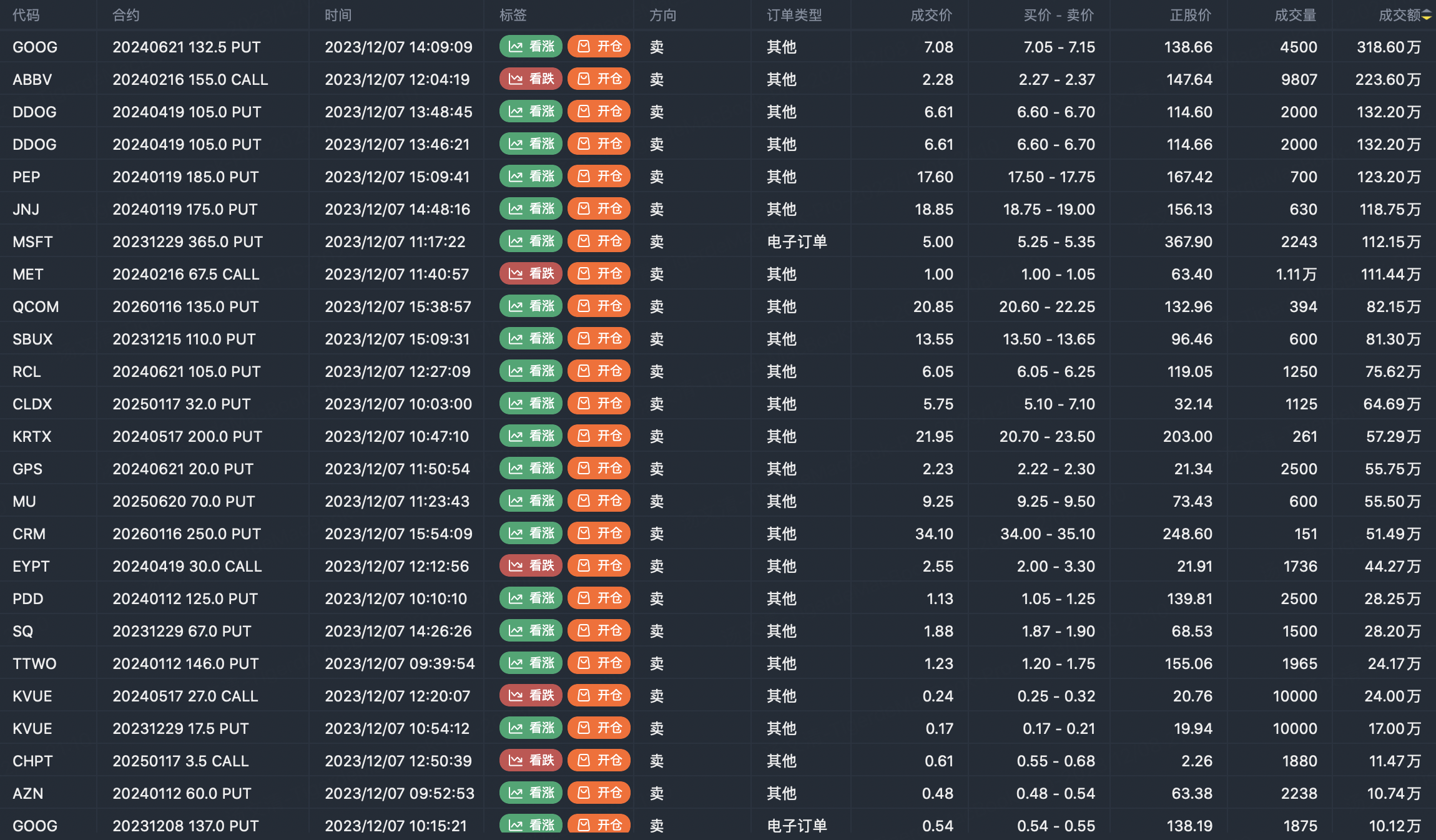 Note: This image data is from Tiger PC. This screen is a significant sell open position for an option contract in the market. A sell of a call option means that the trader believes that the underlying trend has peaked, and a sell of a put option means that the trader believes that the underlying trend has bottomed. These contract openings typically indicate significant activity in the underlying stock, including whether the trader is willing to accumulate a long or short option position.