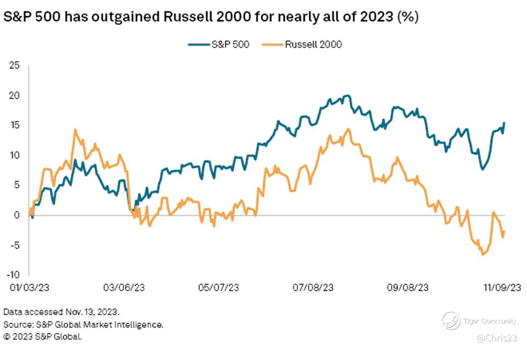 The performance of US Small Cap Stocks faced challenges throughout 2023, with the iShares Russell 2000 ETF ($iShares Russell 2000 ETF(IWM)$) lagging the S&P 500 Index ($S&P 500(.SPX)$), returning a modest 12.95% compared to the S&P's 22.48%. This underperformance was primarily influenced by the dominance of mega-cap names, notably "The Magnificent Seven," which experienced substantial growth amidst significant advancements in AI. However, recent signals from the US Federal Reserve suggest a shift towards a more dovish policy in 2024, aligning with easing inflation trends and approaching the long-term target of 2.5%. This shift is expected to stimulate a broader market rally, fostering increased investor optimism, and expanding market breadth.